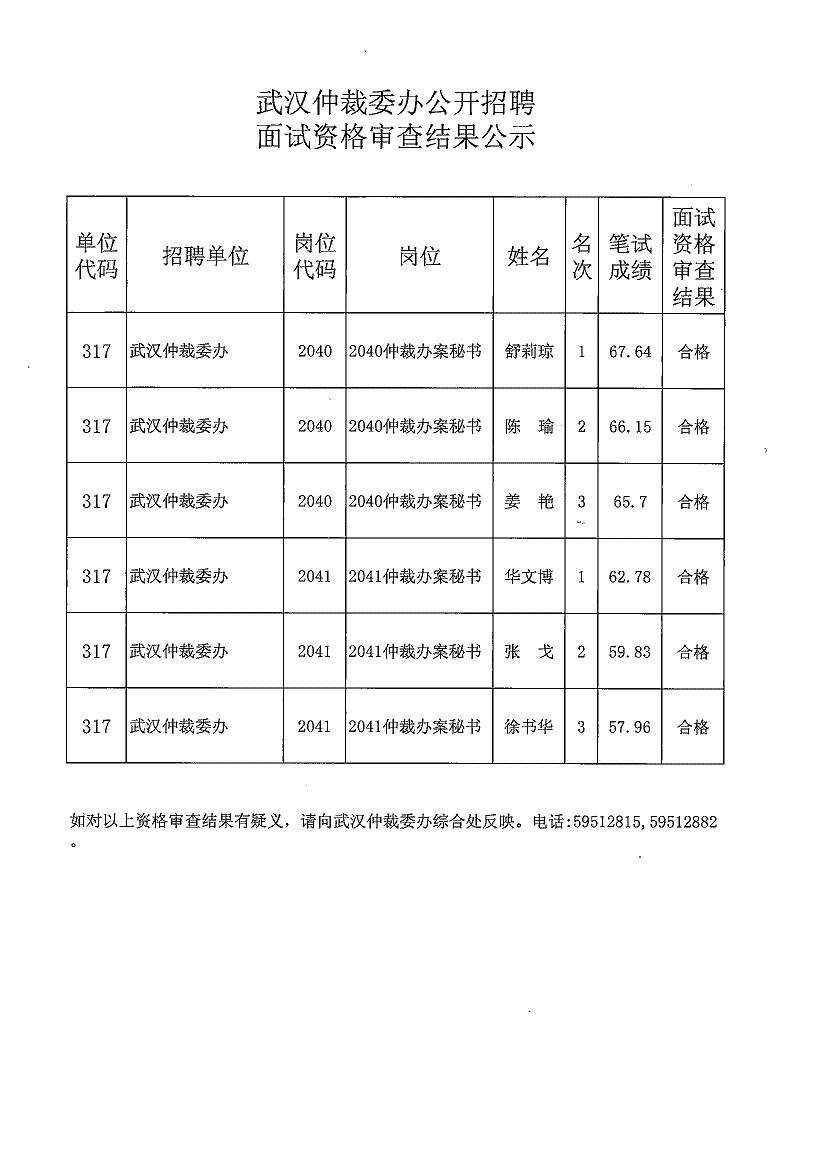 武汉仲裁委员会公开招聘面试资格审查结果公示